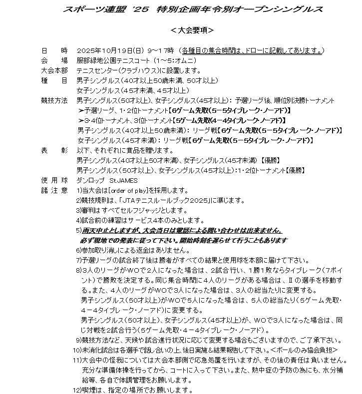 TOPへ   MENUへ   要項   男子S_40〜50歳   男子S_50歳以上   女子S45歳未満   女子S45歳以上